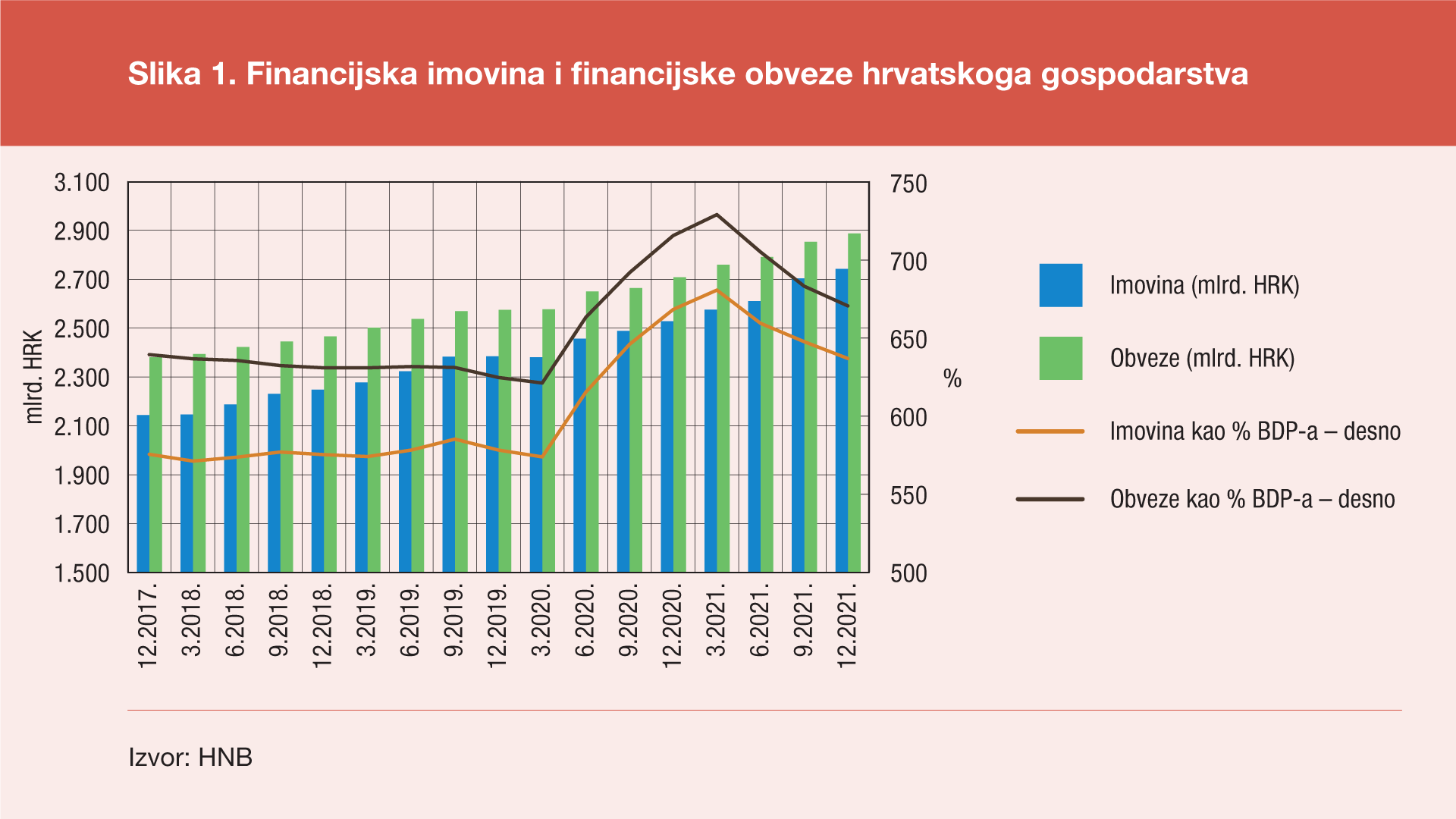 Na kraju četvrtog tromjesečja 2021. (Slika 1.) financijska imovina hrvatskoga gospodarstva iznosila je 2.742 mlrd. HRK, što je povećanje od 39,0 mlrd. HRK u tom tromjesečju i 214,0 mlrd. HRK tijekom 2021. godine. Istodobno, financijske obveze hrvatskoga gospodarstva iznosile su 2.887 mlrd. HRK, a povećale su se za 35,3 mlrd. HRK u tromjesečju odnosno 180,4 mlrd. HRK tijekom protekle godine. U odnosu na BDP financijska imovina hrvatskoga gospodarstva na kraju četvrtog tromjesečja 2021. iznosila je 637% godišnjeg BDP-a, što je smanjenje od 10,6 postotnih bodova u tom tromjesečju i smanjenje od 31,4 postotna boda u razdoblju od godinu dana. Istodobno, financijske obveze hrvatskoga gospodarstva smanjile su se za 12,6 postotnih bodova u tromjesečju i za 45,0 postotnih bodova u godinu dana, te su na kraju četvrtog tromjesečja 2021. dosegnule razinu od 670% godišnjeg BDP-a. Time se nastavilo smanjivanje stanja imovine i obveza hrvatskoga gospodarstva u odnosu na BDP, koje je započelo u drugom tromjesečju 2021. zahvaljujući sporijem rastu njihove vrijednosti u odnosu na rast tromjesečnog BDP-a.