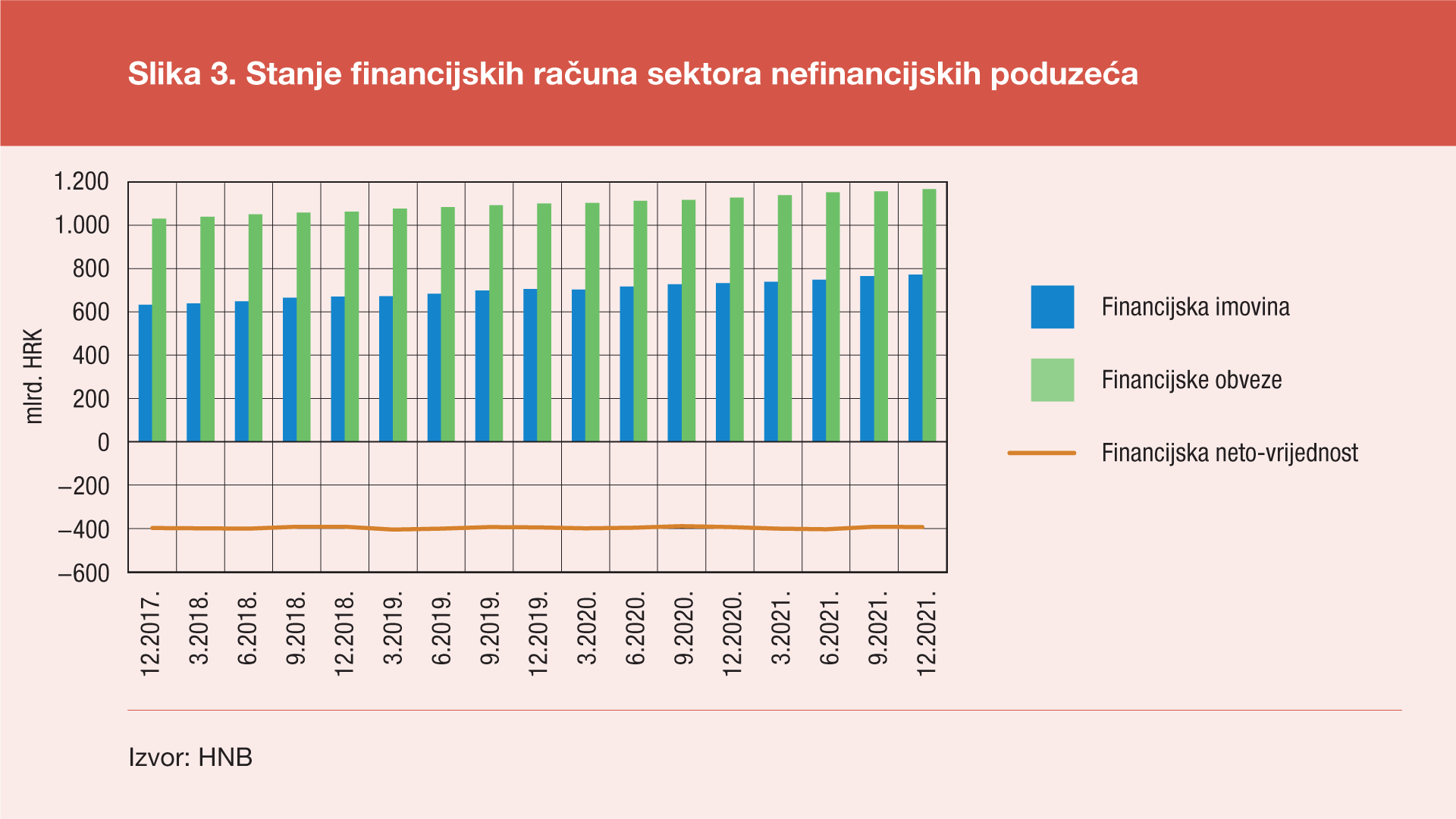 Na kraju četvrtog tromjesečja 2021. (Slika 3.) ukupna financijska imovina nefinancijskih poduzeća iznosila je 772 mlrd. HRK, tj. 0,9% više nego na kraju prethodnog tromjesečja. Financijske obveze nefinancijskih poduzeća iznosile su 1.166 mlrd. HRK, što je rast od 0,8% u odnosu na kraj prethodnog tromjesečja. Rezultat takvih kretanja bilo je smanjenje financijske netovrijednosti sektora nefinancijskih poduzeća na –394 mlrd. HRK, što je za 0,7% manje nego na kraju prethodnog tromjesečja.