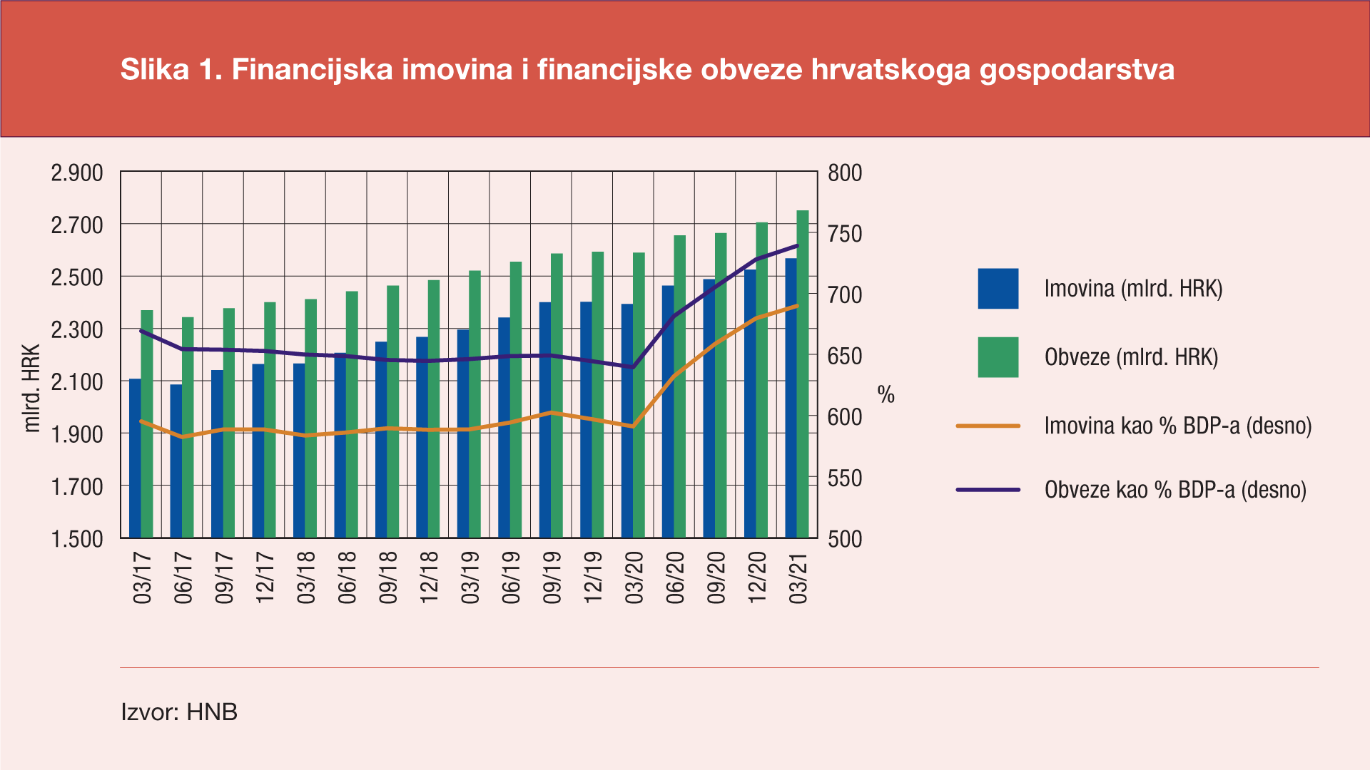Na kraju prvog tromjesečja 2021. (Slika 1.) financijska imovina hrvatskoga gospodarstva iznosila je 2.567 mlrd. HRK, što je povećanje od 42 mlrd. HRK u tom tromjesečju i 174 mlrd. HRK u razdoblju od godine dana. Istodobno, financijske obveze hrvatskoga gospodarstva iznosile su 2.751 mlrd. HRK, a povećale su se za 46 mlrd. HRK u tromjesečju odnosno 162 mlrd. HRK u razdoblju od godine dana. U odnosu na BDP financijska imovina hrvatskoga gospodarstva na kraju prvog tromjesečja 2021. iznosila je 690% godišnjeg BDP-a, što je povećanje od 10 postotnih bodova u tom tromjesečju i 99 postotnih bodova u razdoblju od godinu dana. Istodobno, financijske obveze hrvatskoga gospodarstva povećale su se za 11 postotnih bodova u tromjesečju i 100 postotnih bodova u godinu dana, te su na kraju prvog tromjesečja 2021. dosegnule razinu od 759% godišnjeg BDP-a. Time se nastavio brzi rast stanja imovine i obveza hrvatskoga gospodarstva u odnosu na BDP, zahvaljujući nastavku rasta njihove nominalne vrijednosti, uz istovremeno nepovoljno kretanje tromjesečnog BDP-a, a koji je započeo u drugom tromjesečju 2020. godine.