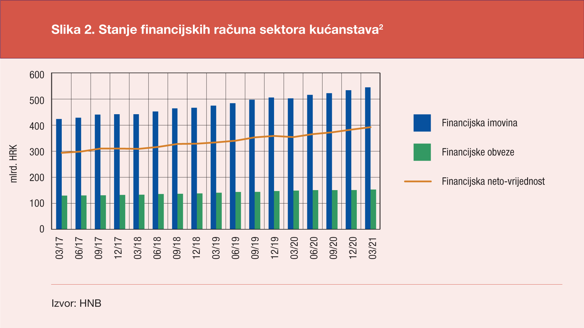 Na kraju prvog tromjesečja 2021. (Slika 2.) ukupna financijska imovina kućanstava iznosila je 545 mlrd. HRK ili 2% više nego na kraju prethodnog tromjesečja. Financijske obveze kućanstava iznosile su 153 mlrd. HRK, što je 1,7% više u odnosu na kraj prethodnog tromjesečja. Ova kretanja rezultirala su povećanjem financijske neto-vrijednosti sektora kućanstava na 392 mlrd. HRK ili 2,4% više nego na kraju prethodnog tromjesečja, čime se nastavio trend postupnog, ali postojanog povećanja financijske neto-vrijednosti ovog sektora.