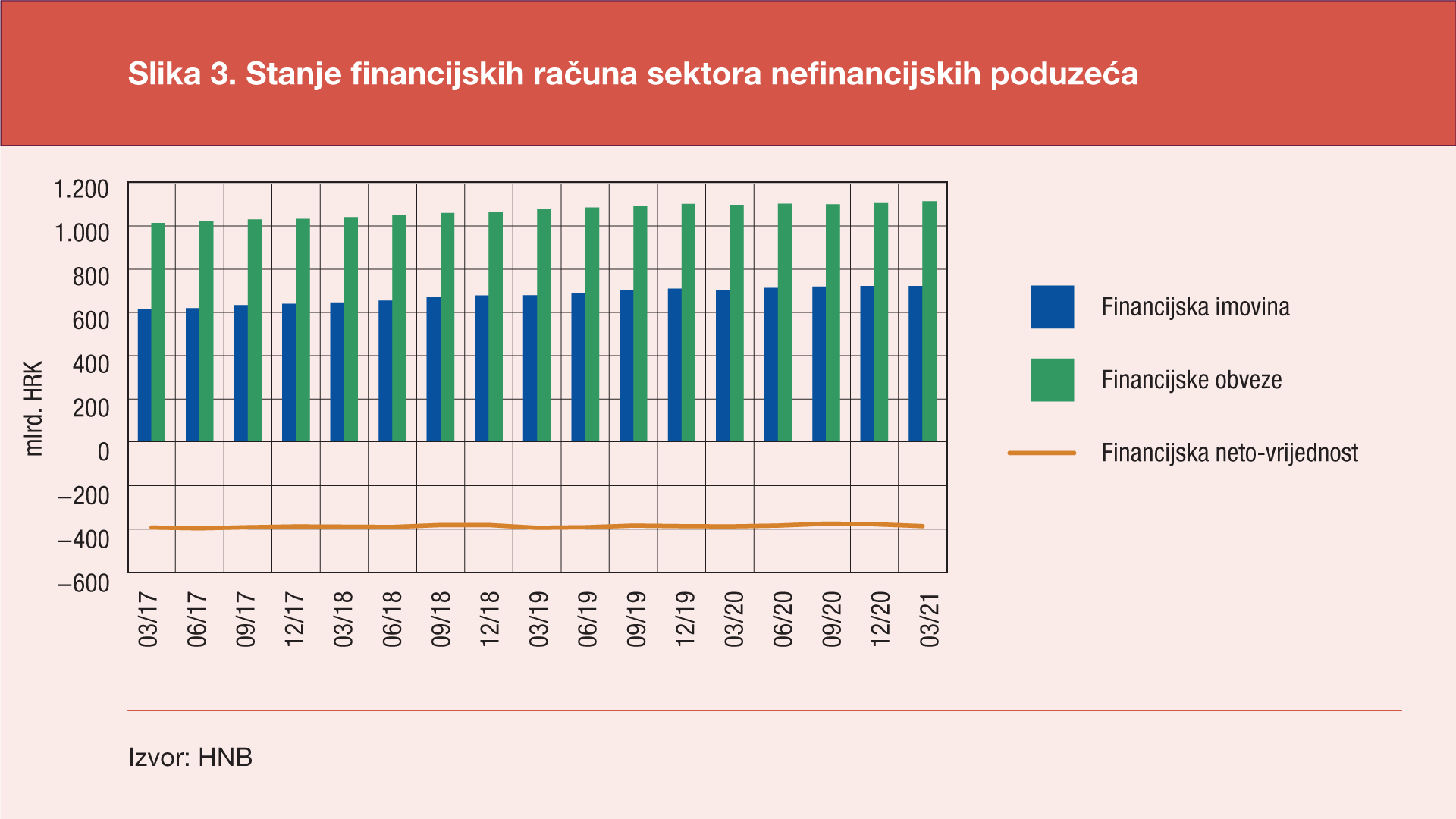 Na kraju prvog tromjesečja 2021. (Slika 3.) ukupna financijska imovina nefinancijskih poduzeća iznosila je 720 mlrd. HRK, tj. 0,1% više nego na kraju prethodnog tromjesečja. Financijske obveze nefinancijskih poduzeća iznosile su 1.113 mlrd. HRK, što je rast od 0,8% u odnosu na kraj prethodnog tromjesečja. Rezultat takvih kretanja bilo je smanjenje financijske neto-vrijednosti sektora nefinancijskih poduzeća na –393 mlrd. HRK, što je 2,2% manje nego na kraju prethodnog tromjesečja.