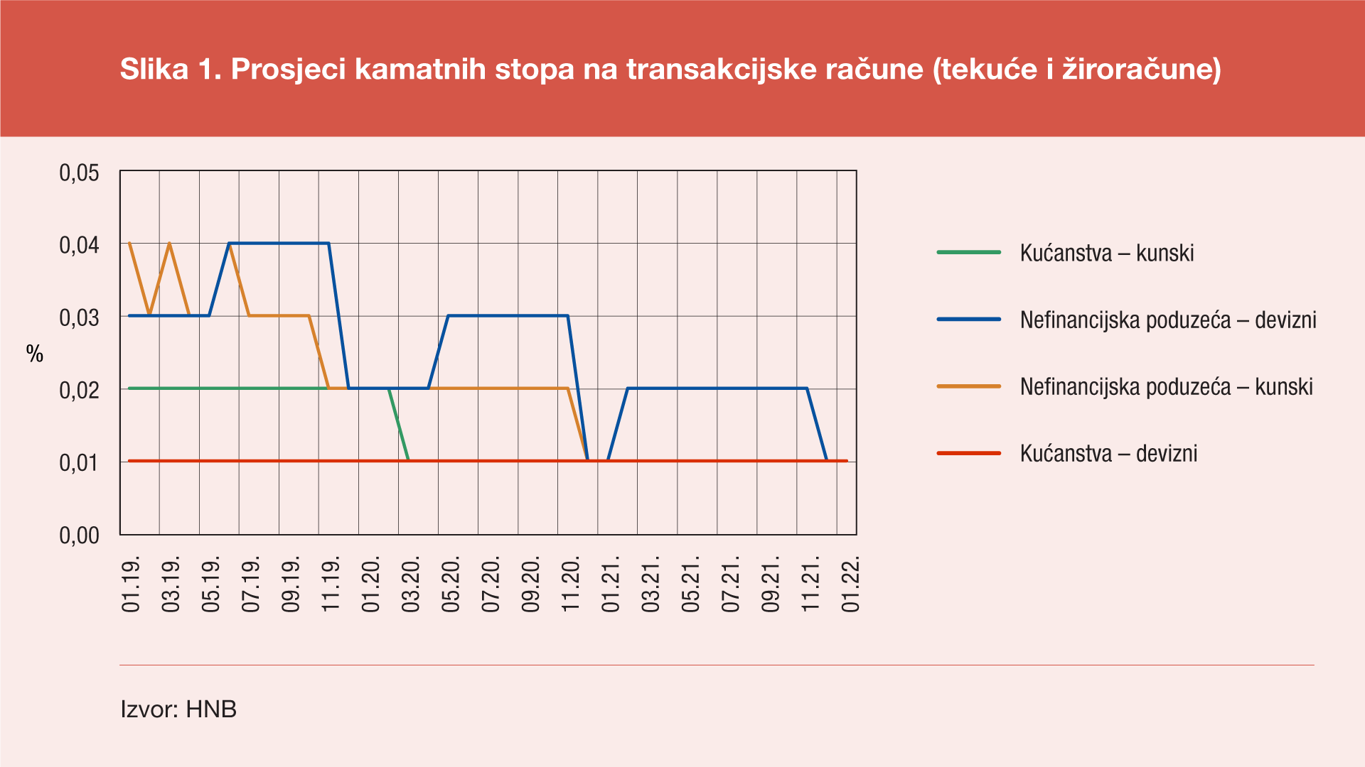Kod transakcijskih računa (tekućih i žiroračuna) u siječnju 2022. prosjeci kamatnih stopa na kunske i devizne račune nefinancijskih poduzeća i kućanstava bili su na istoj razini kao i u siječnju 2021., pri čemu su sva četiri prosjeka iznosila 0,01%.