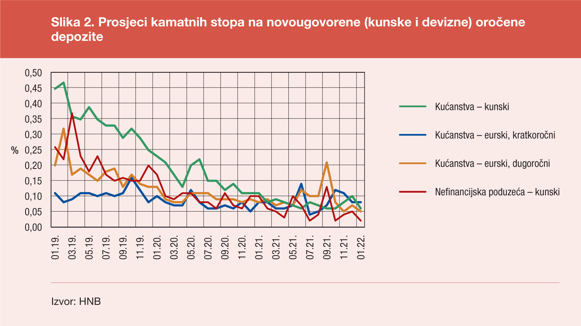 Kod oročenih depozita u siječnju 2022. prosjeci kamatnih stopa za kunske depozite bili su manji nego u istom mjesecu prethodne godine (za 0,05 postotnih bodova kod kućanstava i za 0,08 postotnih bodova kod nefinancijskih poduzeća), kao i prosjek kamatnih stopa za devizne depozite kućanstava u eurima za dugi rok (za 0,03 postotna boda), dok je prosjek kamatnih stopa za devizne depozite kućanstava za kratki rok ostao na istoj razini kao i u siječnju 2021. godine. U siječnju 2022. prosjek kamatnih stopa za oročene kunske depozite kućanstava iznosio je 0,06%, a za dugoročno oročene eurske depozite kućanstava 0,05%. Najniži je bio prosjek kamatnih stopa za oročene kunske depozite nefinancijskih poduzeća (0,02%).