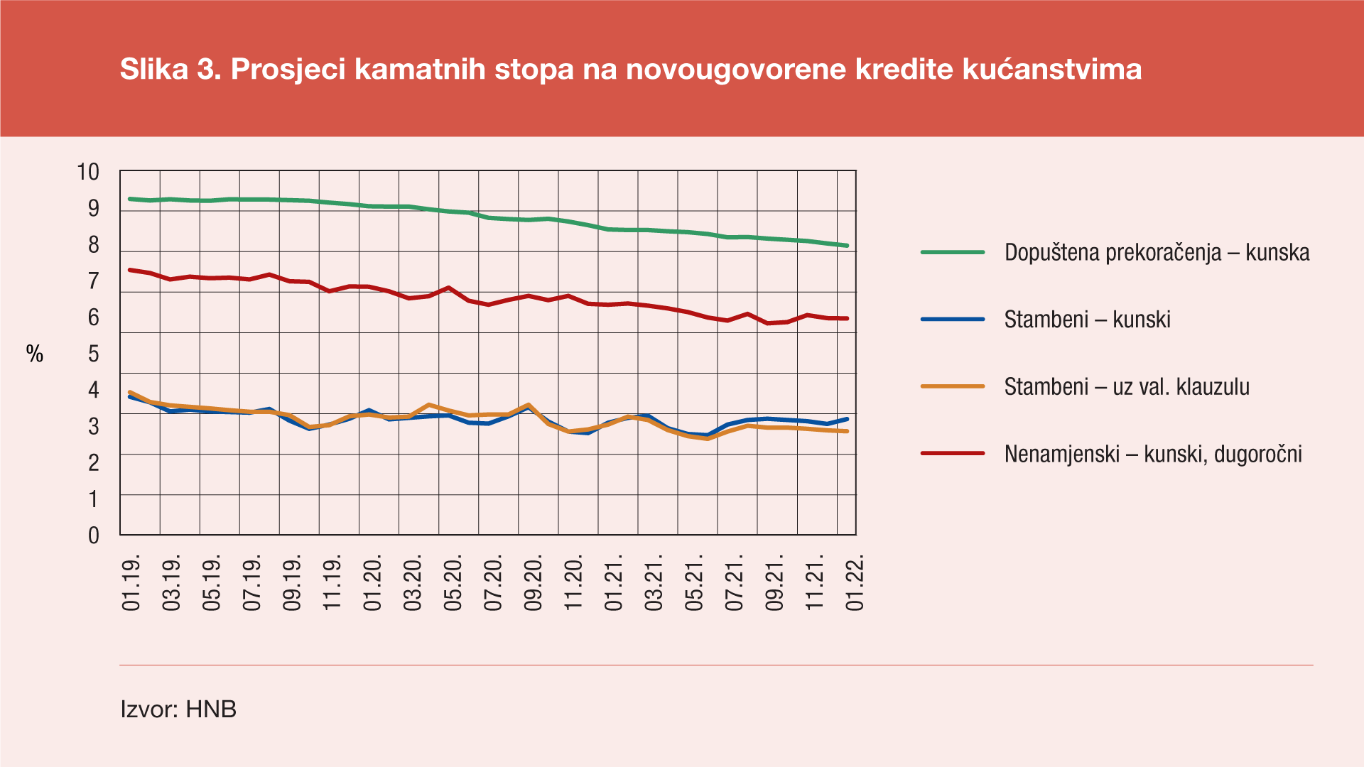 Kod glavnih kategorija kredita odobrenih kućanstvima, u siječnju 2022. najveći prosjek kamatnih stopa zabilježen je kod kunskih kredita na osnovi dopuštenih prekoračenja po transakcijskim računima (7,15%, što je za 0,4 postotna boda manje nego u siječnju 2021.), a najniži kod stambenih kredita odobrenih s valutnom klauzulom (2,57%, što je za 0,16 postotnih bodova manje nego u siječnju 2021.), pri čemu obje kategorije kredita imaju blagi trend pada i na tromjesečnoj i na godišnjoj razini.