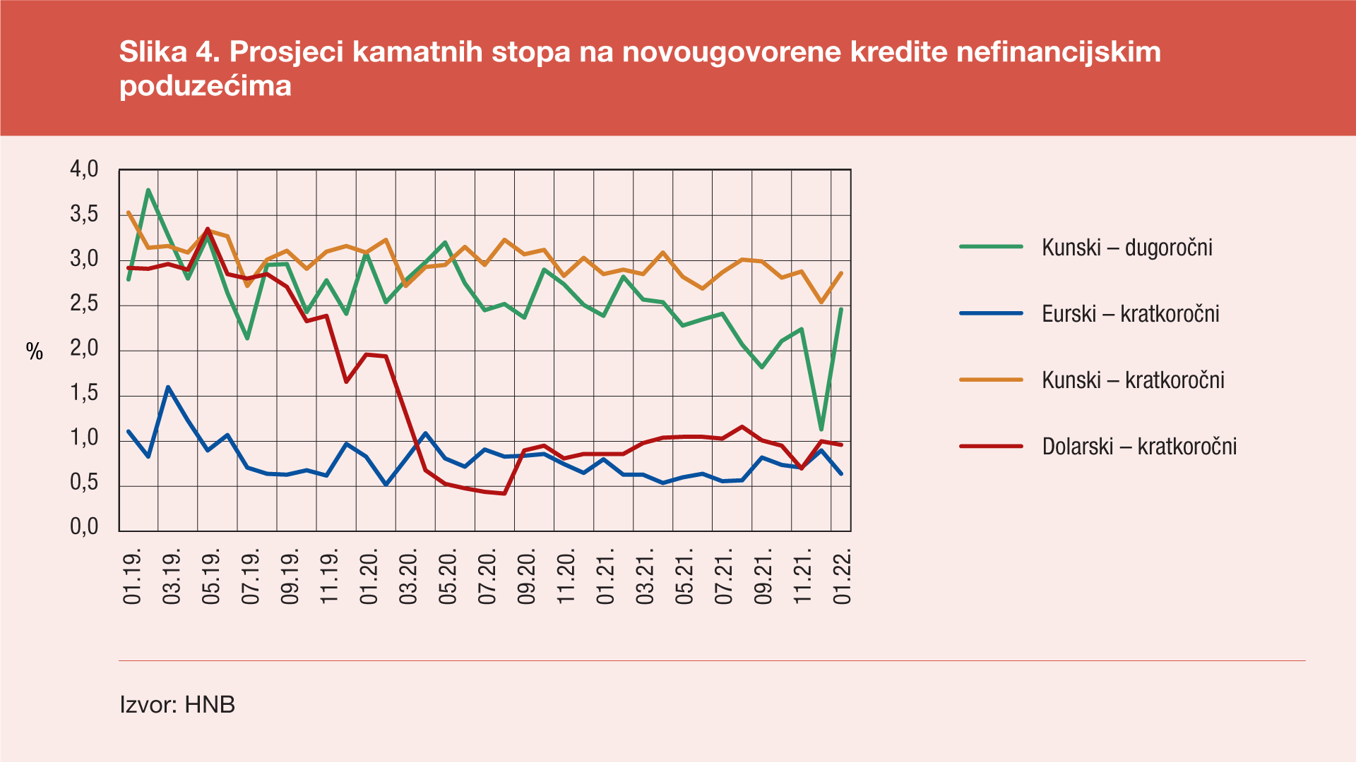 Kod glavnih kategorija kredita odobrenih nefinancijskim poduzećima, u siječnju 2022. najveći prosjek kamatnih stopa zabilježen je kod kratkoročnih kunskih kredita (2,86%, što je za 0,01 postotni bod više nego u siječnju 2021.), a najniži kod kratkoročnih eurskih kredita (0,64%, što je za 0,16 postotnih bodova manje nego u siječnju 2021. godine).
