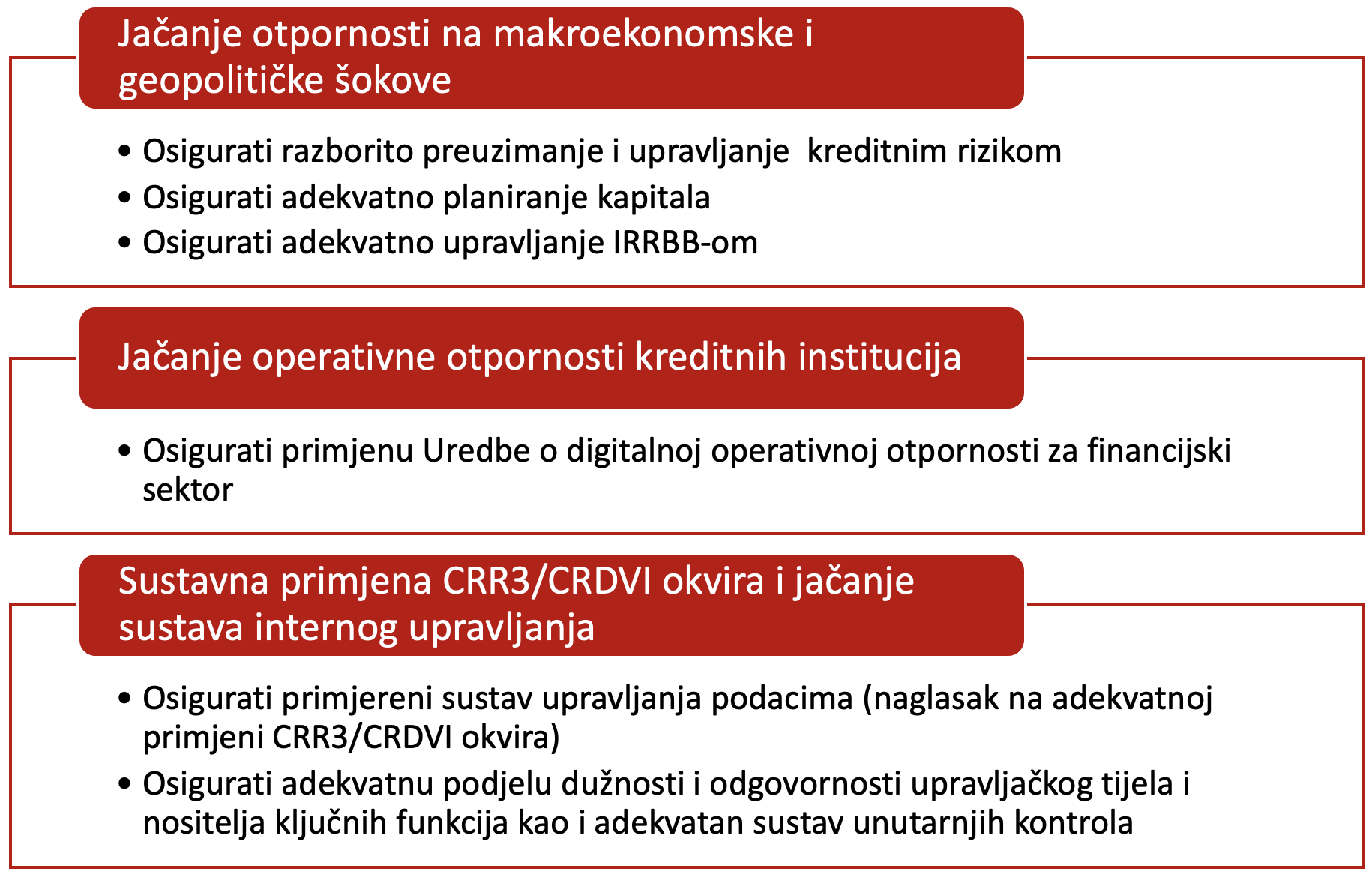 U 2026. glavno područje supervizorskih aktivnosti i dalje je usmjereno na jačanje otpornosti kreditnih institucija na potencijalne šokove, posebice na osnovi procjene primjerenosti njihovih sustava upravljanja kreditnim rizikom. Nadalje, provodit će se provjera usklađenosti kreditnih institucija sa zahtjevima uredbe DORA i provodit će se aktivnosti usmjerene jačanju sustava internog upravljanja uz horizontalne analize primjene novoga regulatornog okvira.
