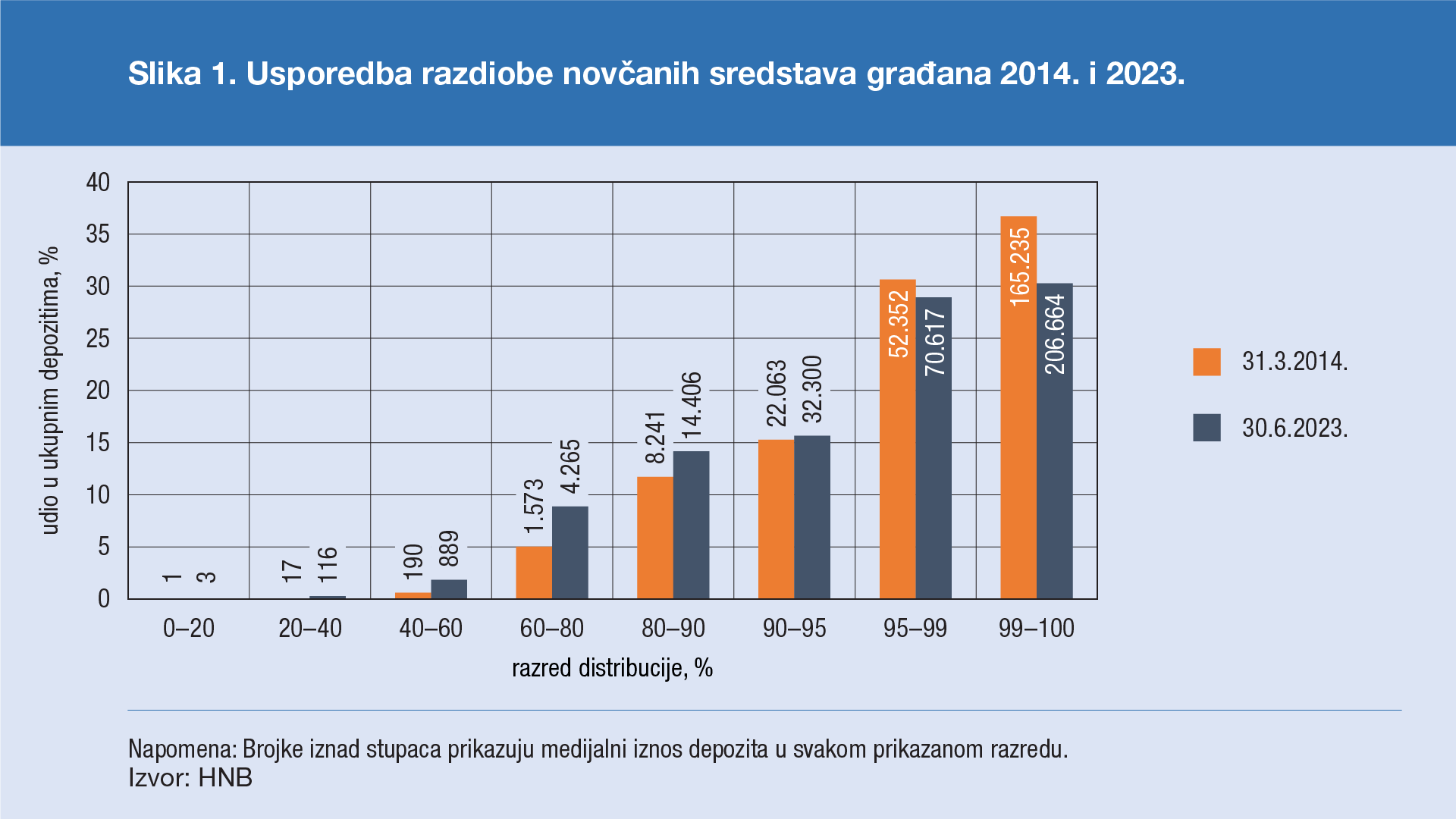 U proteklom je desetljeću vidljivo blago smanjenje koncentracije depozita. Depoziti su osjetno porasli u svim promatranim skupinama, a relativan je porast bio izraženiji u nižim razredima razdiobe. No, iznosi depozita u donjoj polovini razdiobe ostali su vrlo niski, kao i udjeli njihovih vlasnika u agregatnoj vrijednosti svih depozita. Istodobno su porasli iznosi i udjeli depozita vlasnika računa koji drže iznose veće nego prosječni deponent (odnosno oko 900 eura). S druge strane, ukupan udio depozita vlasnika u najvišim razredima – odnosno sredstava koja drži 5% vlasnika najvećih pojedinačnih iznosa – smanjio se za 8,2%, odnosno sa 67,3% na 59,1%. Osobito je bilo izraženo smanjenje udjela za 1% vlasnika s najvišim iznosima, s 36,7% u 2014. na 30,2% u 2023. godini. Navedeni podaci tako pokazuju manju koncentraciju depozita kod vlasnika najvećih iznosa depozita u 2023. u odnosu na 2014. godinu, odnosno blago smanjenje nejednakosti u razdiobi depozita među građanima.