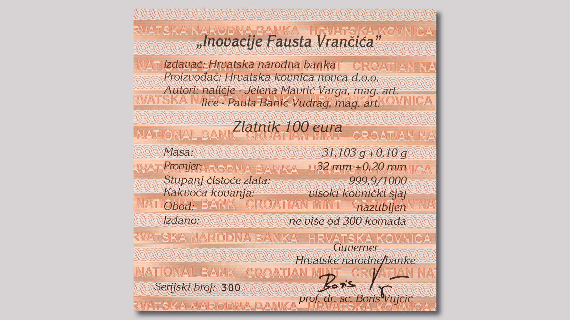 The Croatian National Bank has issued “Faust Vrančić’s Innovations” gold and silver numismatic coins as part of the “Croatian Inventors” numismatic coin series with the objective of promoting prominent historical and scientific motifs in the Republic of Croatia and the world.