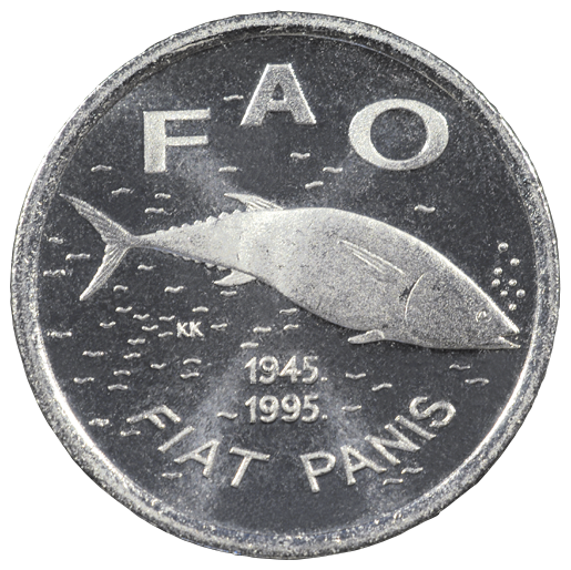 Motif on the reverse: the centre of the coin features a tuna, a large fish of the Scombridae family, against the background showing an array of miniature ornaments symbolising sea water. The inscription "FAO", an acronym standing for the Food and Agriculture Organisation is displayed semi-circularly, above the tuna fish image, while the years "1945." and "1995" are inscribed in two lines below the image. The Latin inscription "FIAT PANIS" (Let there be bread), the FAO motto, is displayed along the edge of the lower semi-circle.
