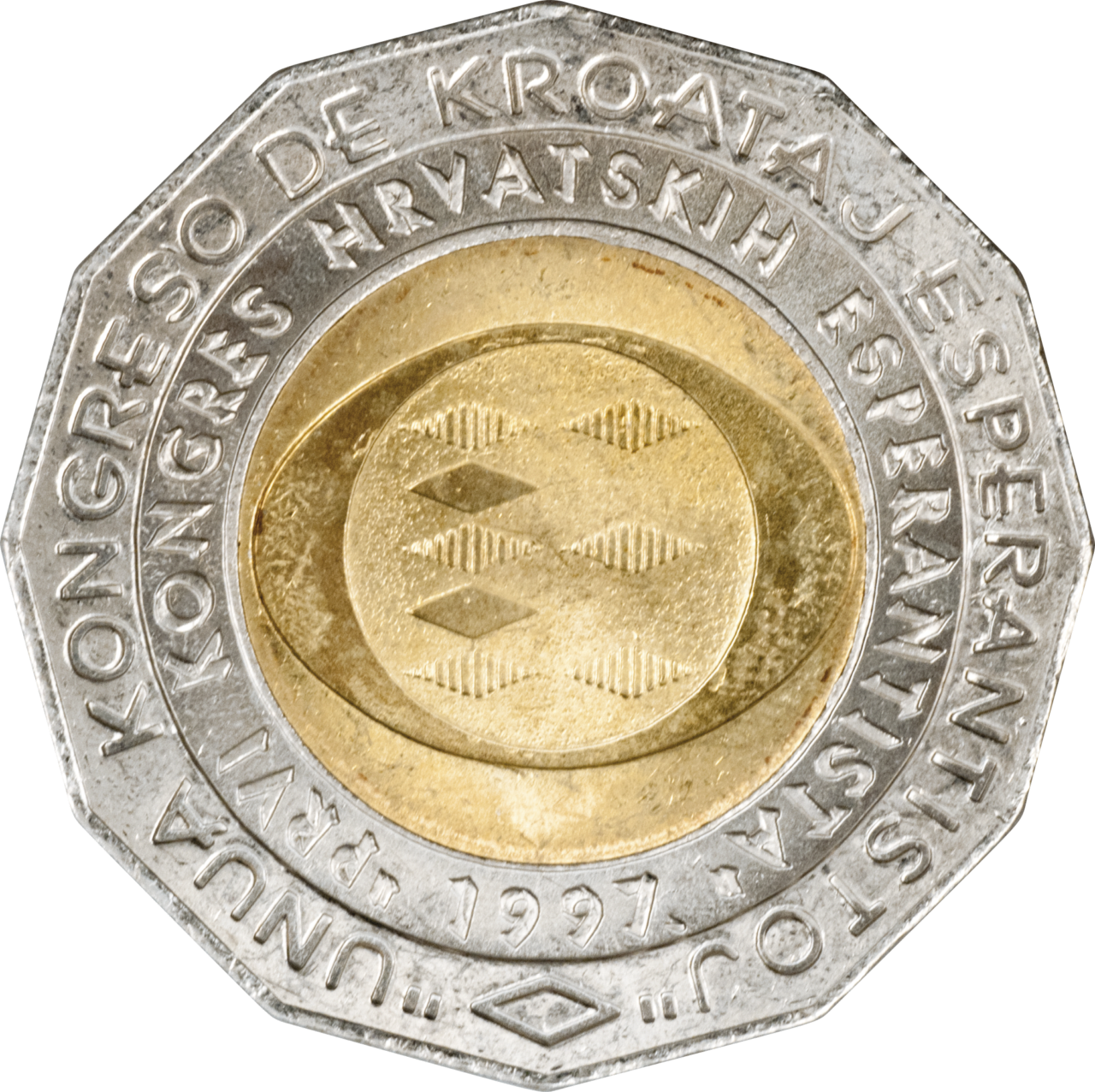 Motif on the obverse: the central part of the coin's core carries the symbol of the Congress, an elliptic circle within which eight elongated rhombs are placed in two vertical columns, pointing at one another with their tips. Of the five rhombs in the left column, the third and the fifth are filled with vertical lines. The right column contains three rhombs, all filled with vertical lines, symbolizing the red and white fields of the Croatian historical coat of arms. All eight rhombs are connected, forming the capital letter "E" (i.e. Esperanto). An identical rhomb is placed centrally at the lower part of the ring, with the inscription "UNUA KONGRESO DE KROATAJ ESPERANTISTOJ" beginning on the left side of the rhomb and stretching along the ring to the its right side. The second, inner, strip of the ring's surface features the inscription "PRVI KONGRES HRVATSKIH ESPERANTISTA", separated by the minting year, "1997", placed centrally in the lower part of the strip, above the elongated rhomb.