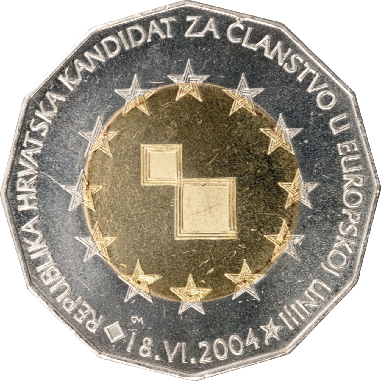 Motif on the obverse: the central part of the coin core features two squares symbolising the Republic of Croatia, placed one above the other with touching corners. The squares' edges, shown as if in motion, are formed by three lines, modelled after the Croatian wattle. The loose lines in the right upper corner of the lower bigger square are a symbol Croatia's openness towards the European Union. These lines stretch over to the coin ring embossed with twelve EU stars, which are interlaced by the Croatian wattle, as a symbol of Croatia's determination to become an integral part of the EU. Positioned centrally along the lower edge and bordered by a small square on the left and a small star on the right is the date "18 June 2004". The inscription "REPUBLIKA HRVATSKA KANDIDAT ZA ČLANSTVO U EUROPSKOJ UNIJI" continues from the date to the right, closing the circle on the coin.
