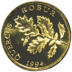 Motif on the reverse: the centre of the coin features a stylised common oak branch with acorns. The inscription "HRAST LUŽNJAK" (Lat. QUERCUS ROBUR) is displayed above the image, circularly along the edge of the coin. The minting year is positioned centrally along the lower edge.