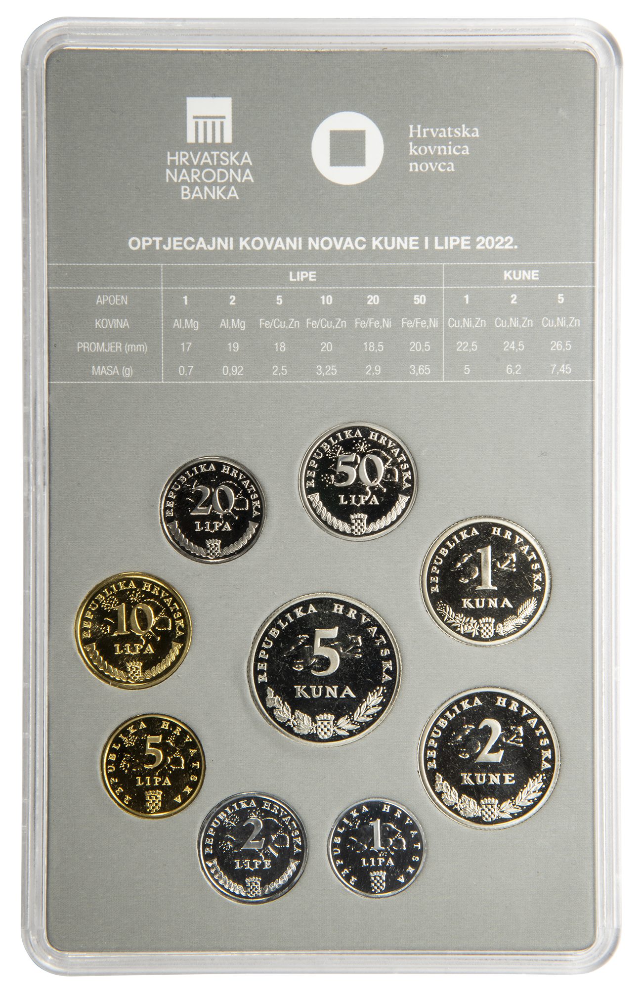 The Croatian National Bank issued a numismatic set of kuna and lipa circulation coins of the Republic of Croatia, with mint year 2022. The Decision on the issue of the numismatic set of Croatian kuna and lipa circulation coins with mint year 2022 was published in the Official Gazette No. 150/2022.