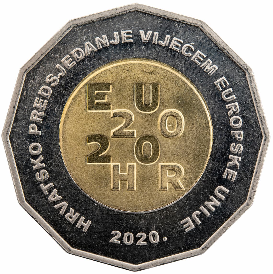 Motif on the obverse: the inner part of the core features a presentation of the official logo of the “Typographic Chessboard” to mark the Croatian Presidency of the Council of the European Union 2020, which is a typographic image made up of letters and numbers whose relative position evokes the squares of the coat of arms of the Republic of Croatia. By composition, using the acronyms “HR” and “EU” and the presidency year “2020”, it conveys the connection between Croatia and the European Union. The inscription “HRVATSKO PREDSJEDANJE VIJEĆEM EUROPSKE UNIJE” (CROATIAN PRESIDENCY OF THE COUNCIL OF THE EUROPEAN UNION) is laid out circularly within the ring. The year of release of the coin “2020” is positioned below the core, on the coin’s ring surface.