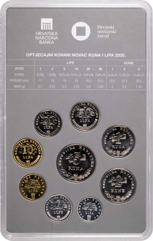 The Croatian National Bank issued a numismatic set of Croatian kuna and lipa circulation coins, with mint year 2020. The Decision on the issue of the numismatic sets of Croatian kuna and lipa circulation coins with mint year 2020 was published in the Official Gazette No. 138/2020.