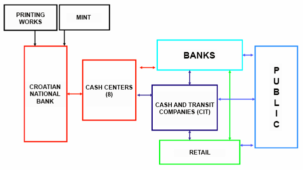 The Croatian National Bank has organised the cash supply through cash centres where banks withdraw cash, debiting their accounts with the Croatian National Bank, or deposit cash, crediting their accounts with the Croatian National Bank.