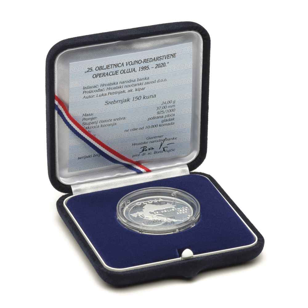 Odluka o izdavanju i prodaji prigodnoga srebrnoga kovanog novca "25. OBLJETNICA VOJNO-REDARSTVENE OPERACIJE OLUJA, 1995. – 2020." objavljena je u "Narodnim novinama", br. 84/2020.